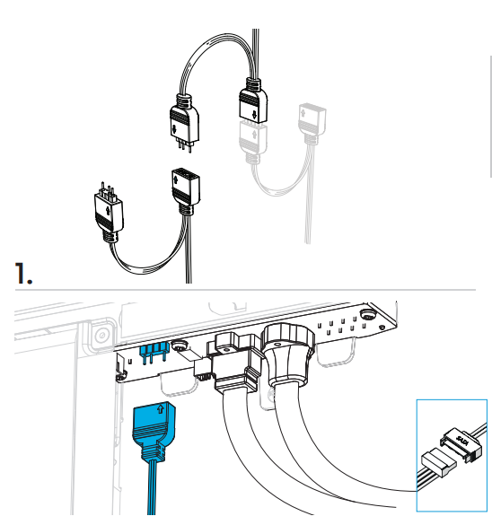 To control the RGB-fans, first connect the SATA-cable from the front I/O to your power supply. After that, chain the cables inside of the case together and install the 3-pin RGB-cable from the last chained cable to the connector on the I/O: