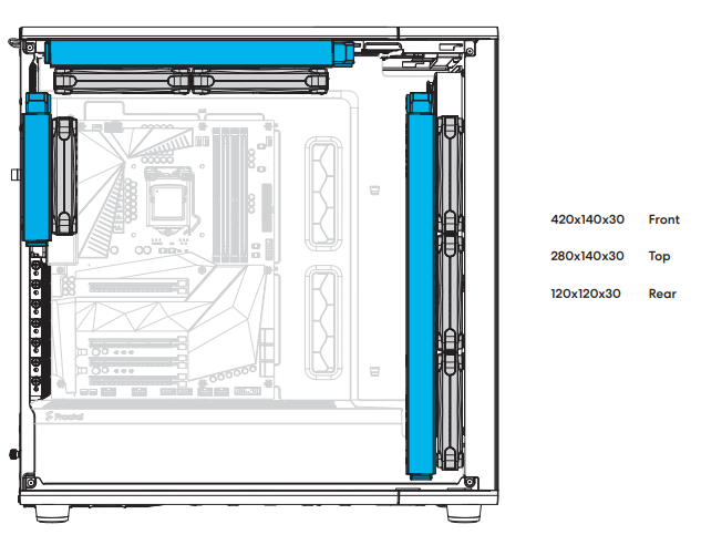 The North XL ME can support 120 mm radiators in the rear, 360 mm radiators in the top, and up to 420 mm radiators in the front. Note that certain combinations will cause compatibility issues. See further down for more information.