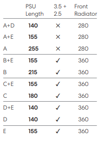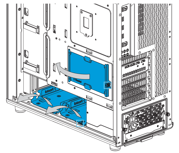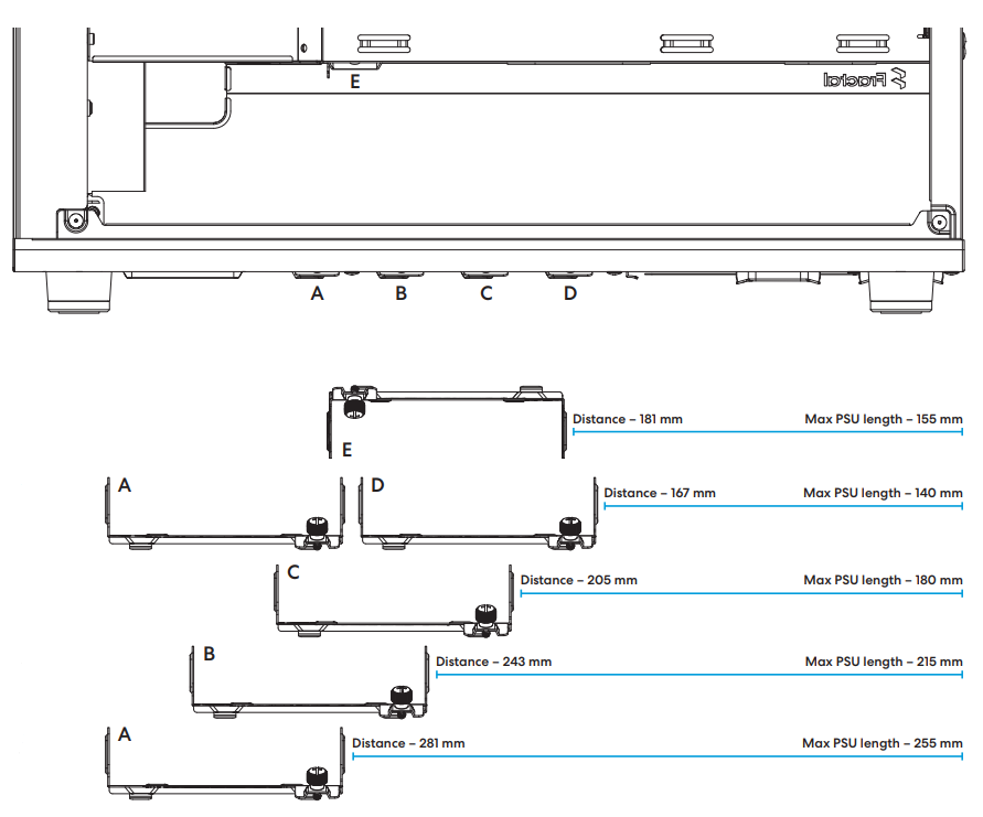 The bottom of the case has multiple positions where the combined trays can be installed. The different positions gives support to different lengths of GPU and different size of front radiators: